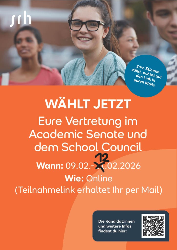 seit Montag, 09.02.2026 (09:00) bis Donnerstag, 12.02.2026 (24:00), finden die Wahlen Ihrer studentischen Vertretungen im Academic Senate und dem Council Ihrer School statt. Bitte beachten Sie, dass der Wahlzeitraum aufgrund technischer Herausforderungen zu Wahlbeginn durch Beschluss der Wahlleitung um einen Tag verlängert wurde. WÄHLEN SIE JETZT IHRE STUDENTISCHE VERTRETUNG IN DEN GREMIEN! Wen kann ich wählen? Informationen zu den Kandidat:innen finden Sie hier im Padlet. Wie kann ich wählen? Die Stimmabgabe erfolgt durch den einen einmaligem Abstimmungslink, den Sie heute auf Ihre Hochschul-E-Mail-Adresse erhalten. Bitte prüfen Sie Ihre Hochschulmails. Die Wahl findet anonym statt. Wir bedanken uns für Ihre Teilnahme. Bei Fragen rund um die Wahl stehen Ihnen die Wahlleitung (K. Prutek und J. Neef) unter wahlen.hshd@srh.de zur Verfügung. Beste Grüße Ihre Wahlleitung (K. Prutek / J. Neef)