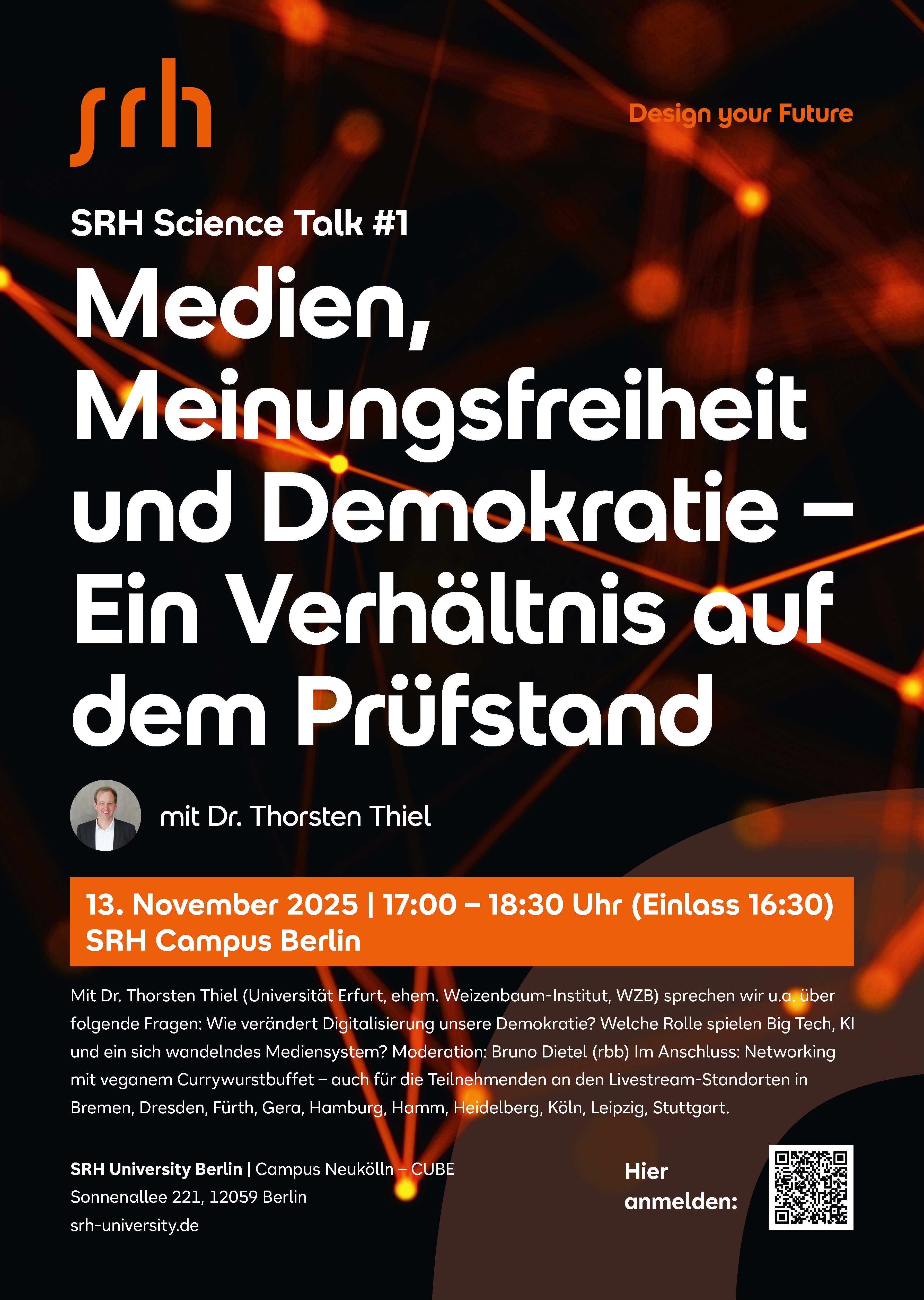Sie wollen zu wichtigen Themen unserer Zeit up-to-date bleiben und mit Top-Persönlichkeiten darüber ins Gespräch kommen? Am 13.11.2025 beginnt am Campus Berlin die erste Veranstaltung der Vortragsreihe SRH Science Talk mit Dr. Thorsten Thiel, Professor für Demokratieförderung und Digitalpolitik an der Universität Erfurt, als Gastredner. Das Thema lautet: “Digitalisierung als Gefahr für die Demokratie: Die Eckpfeiler der aktuellen Diskussion.”. Thorsten Thiel ist von 2017-2022 Leiter der Forschungsgruppe „Demokratie und Digitalisierung“ am Weizenbaum-Institut für die vernetzte Gesellschaft und wissenschaftlicher Mitarbeiter am Wissenschaftszentrum Berlin (WZB). Davor Koordinator des Leibniz-Forschungsverbundes „Krisen einer globalisierten Welt“ und Postdoc am Exzellenzcluster „Die Herausbildung normativer Ordnungen“ in Frankfurt a. M.