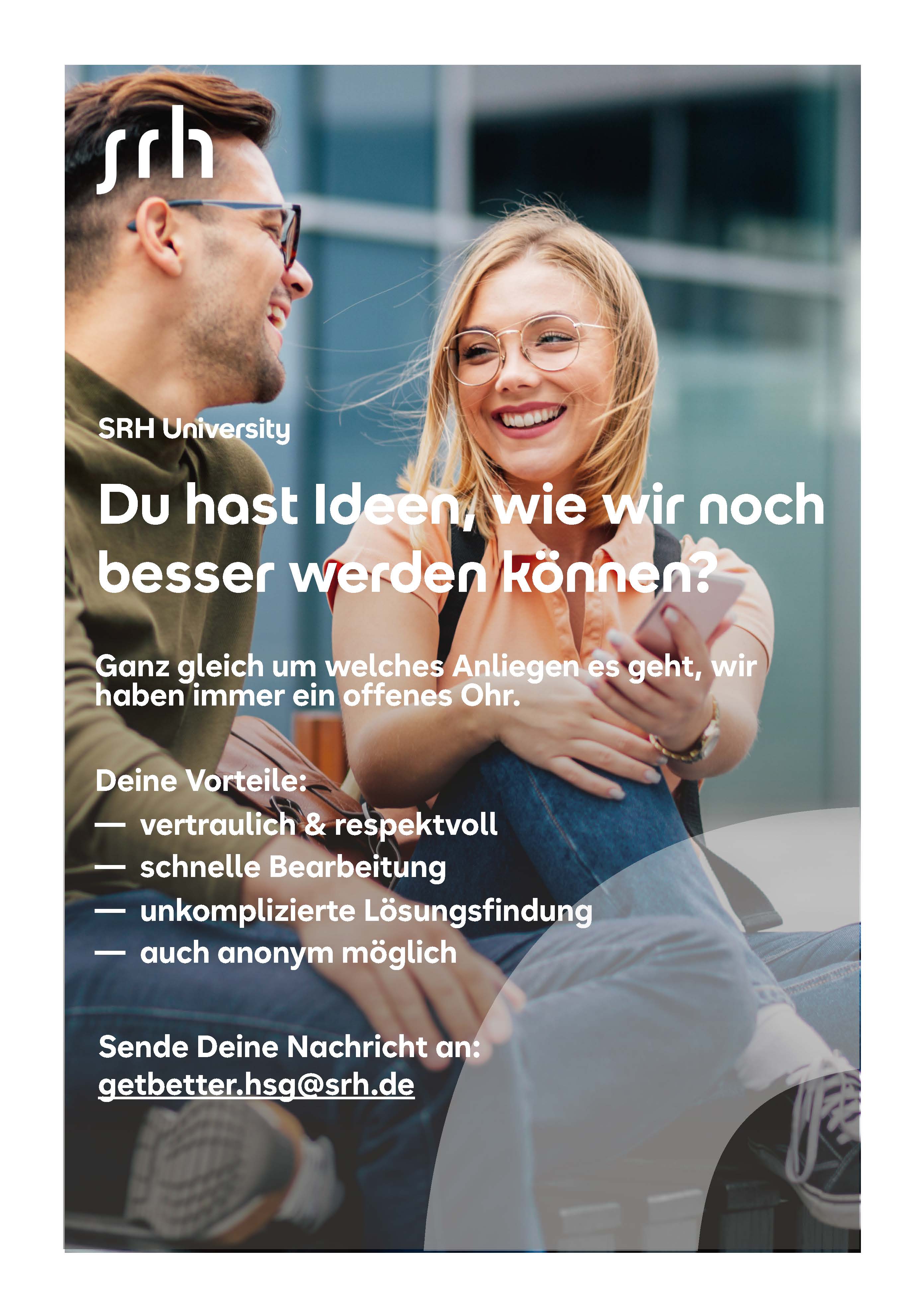 Studienerfahrung. Wir freuen uns auf Ihre Rückmeldungen! Ihr SRH University-Team
