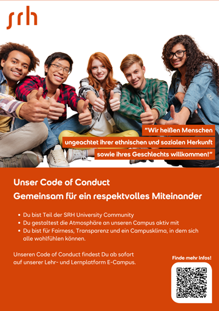 Bitte lesen Sie unseren Code of Conduct gründlich durch. Mit dem Code of Conduct verpflichten wir uns alle, die Werte der SRH University zu achten, unser Zusammengehörigkeitsgefühl zu stärken und eine Hochschule zu schaffen an der sich jeder wohlfühlt. Herzliche Grüße Ihr SRH University-Team